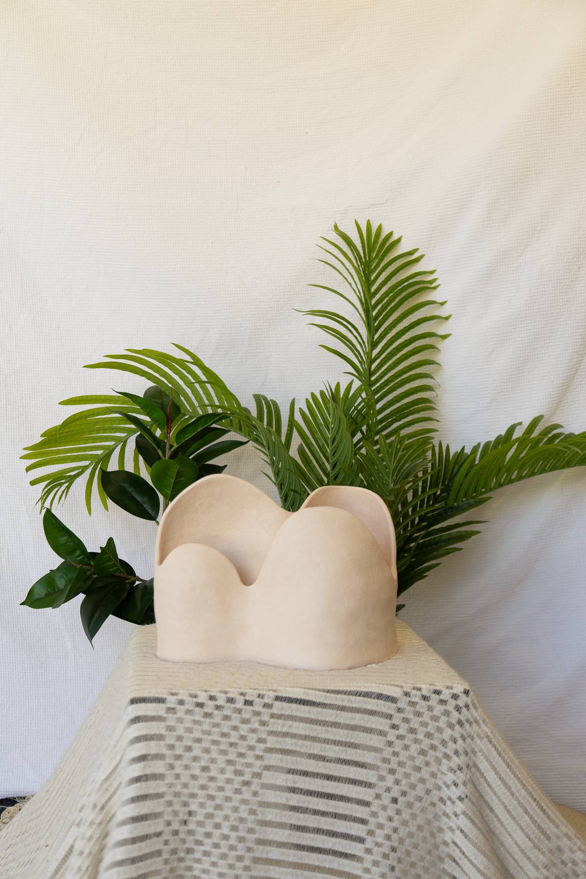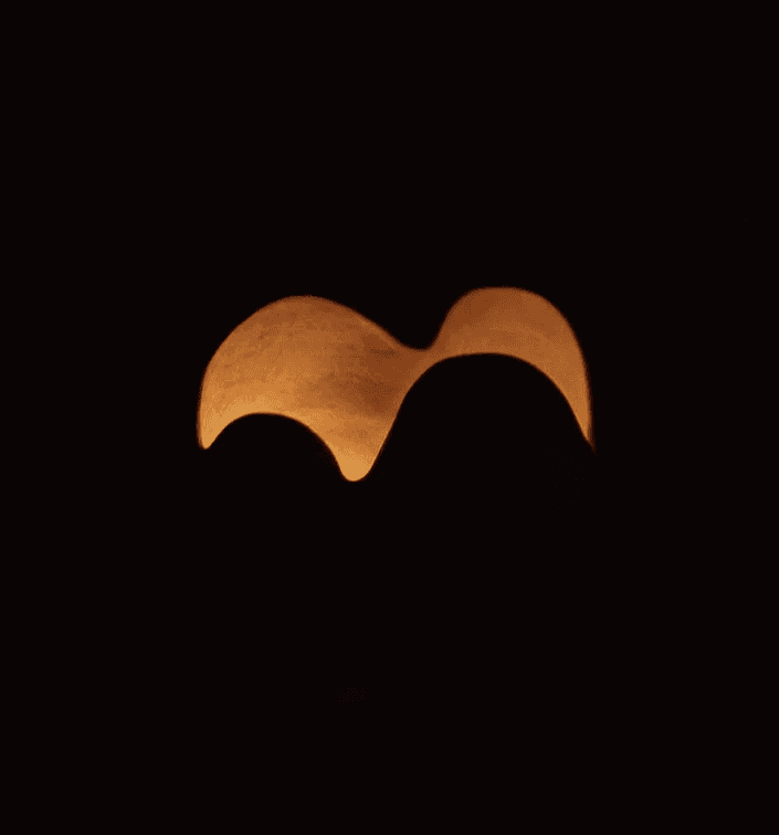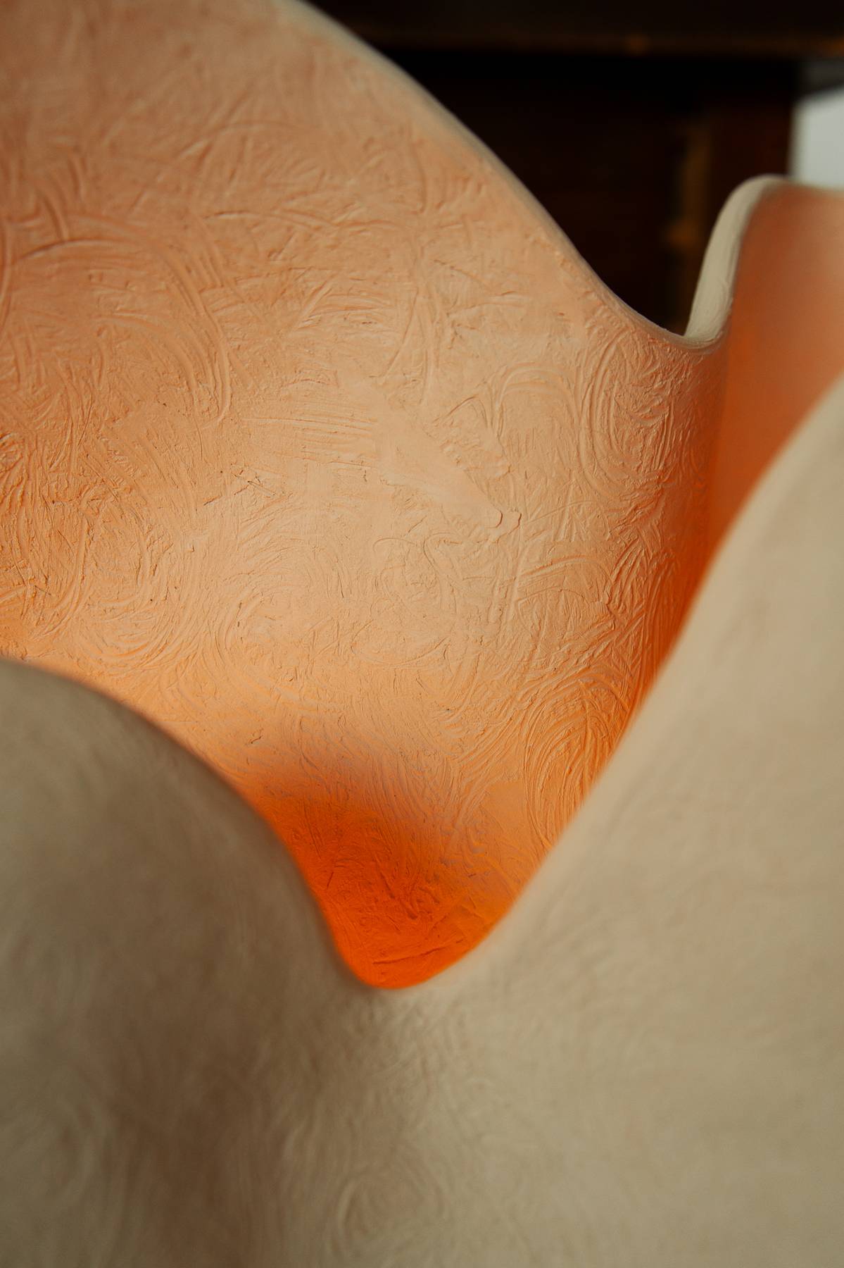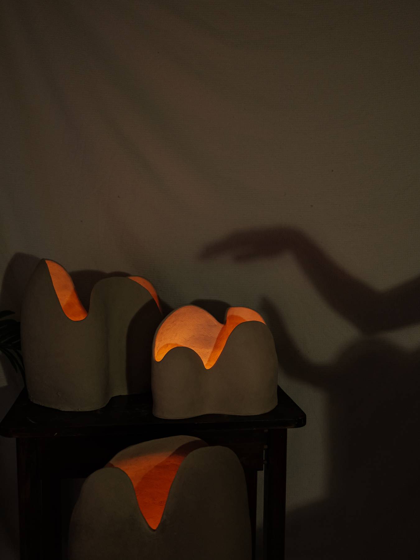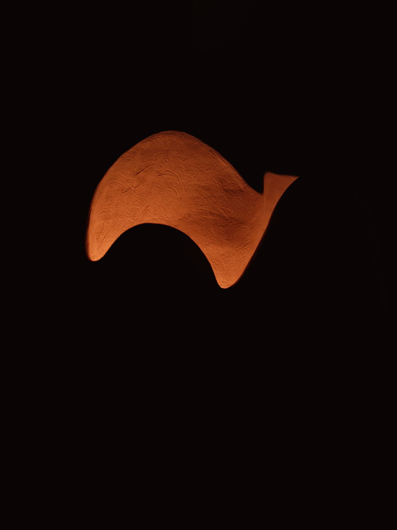 Dune is a stoneware sculpture defined by soft, organic walls that rise and curve along the top edge. A concealed LED light within the hollow form illuminates the interior surfaces, producing a warm, ambient glow.