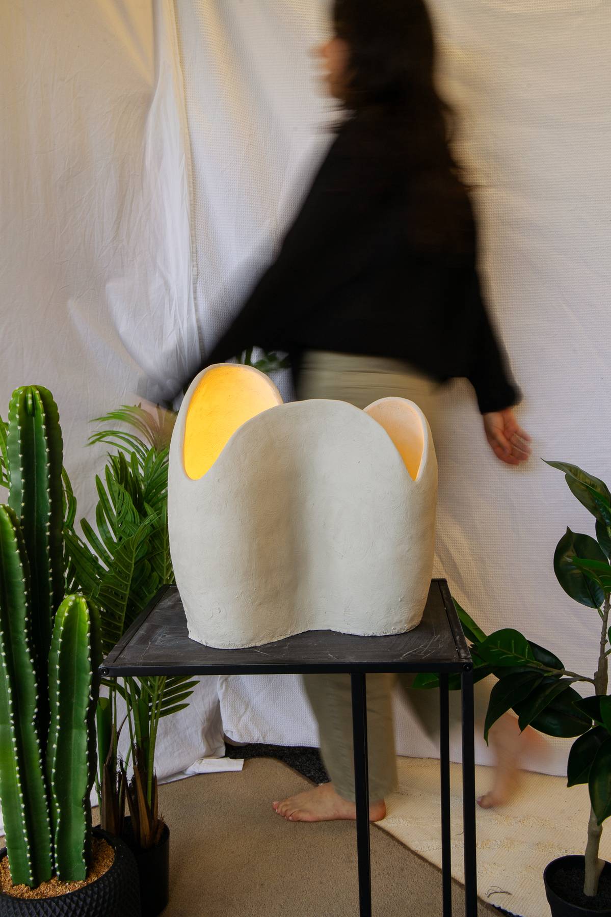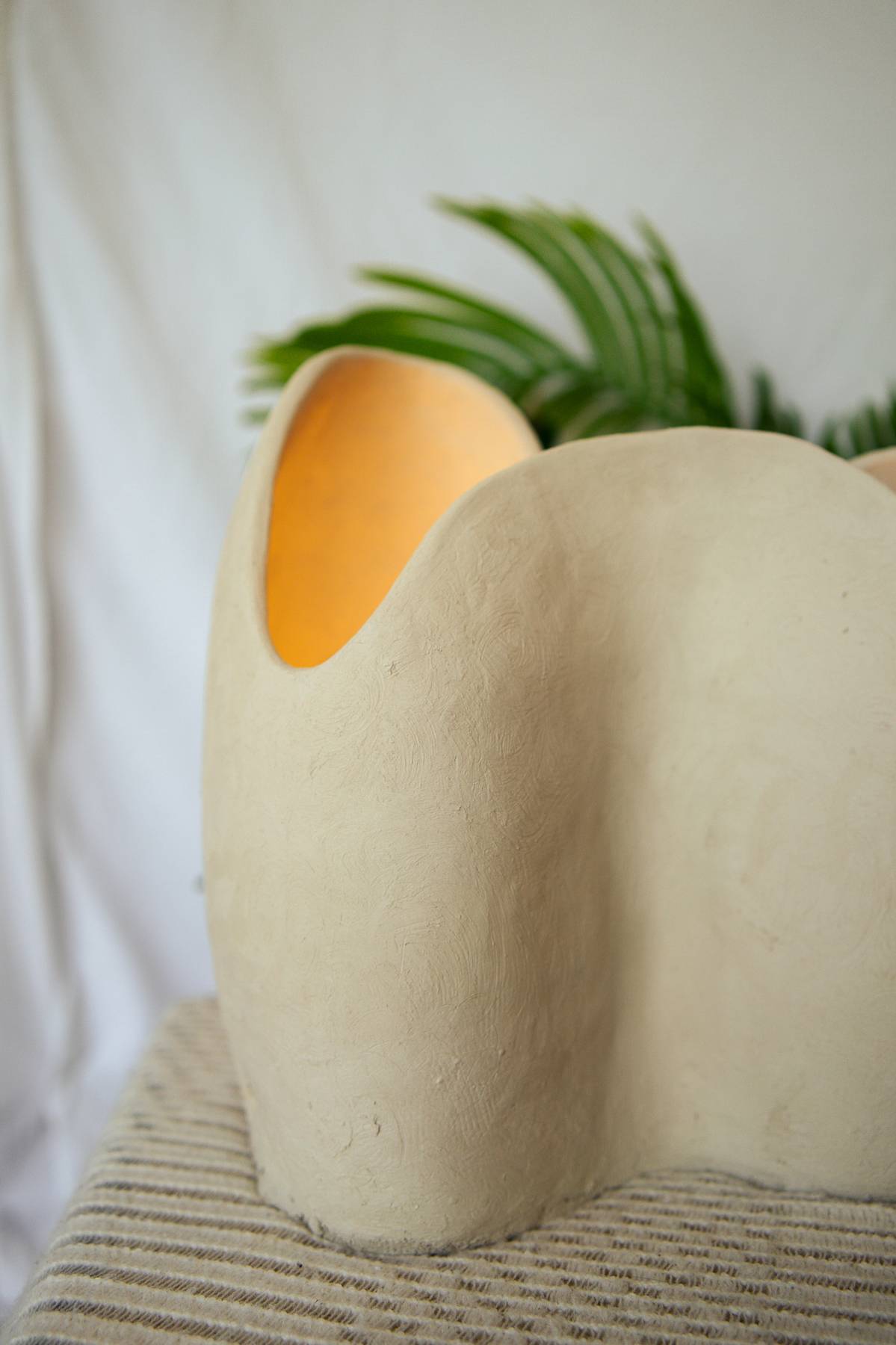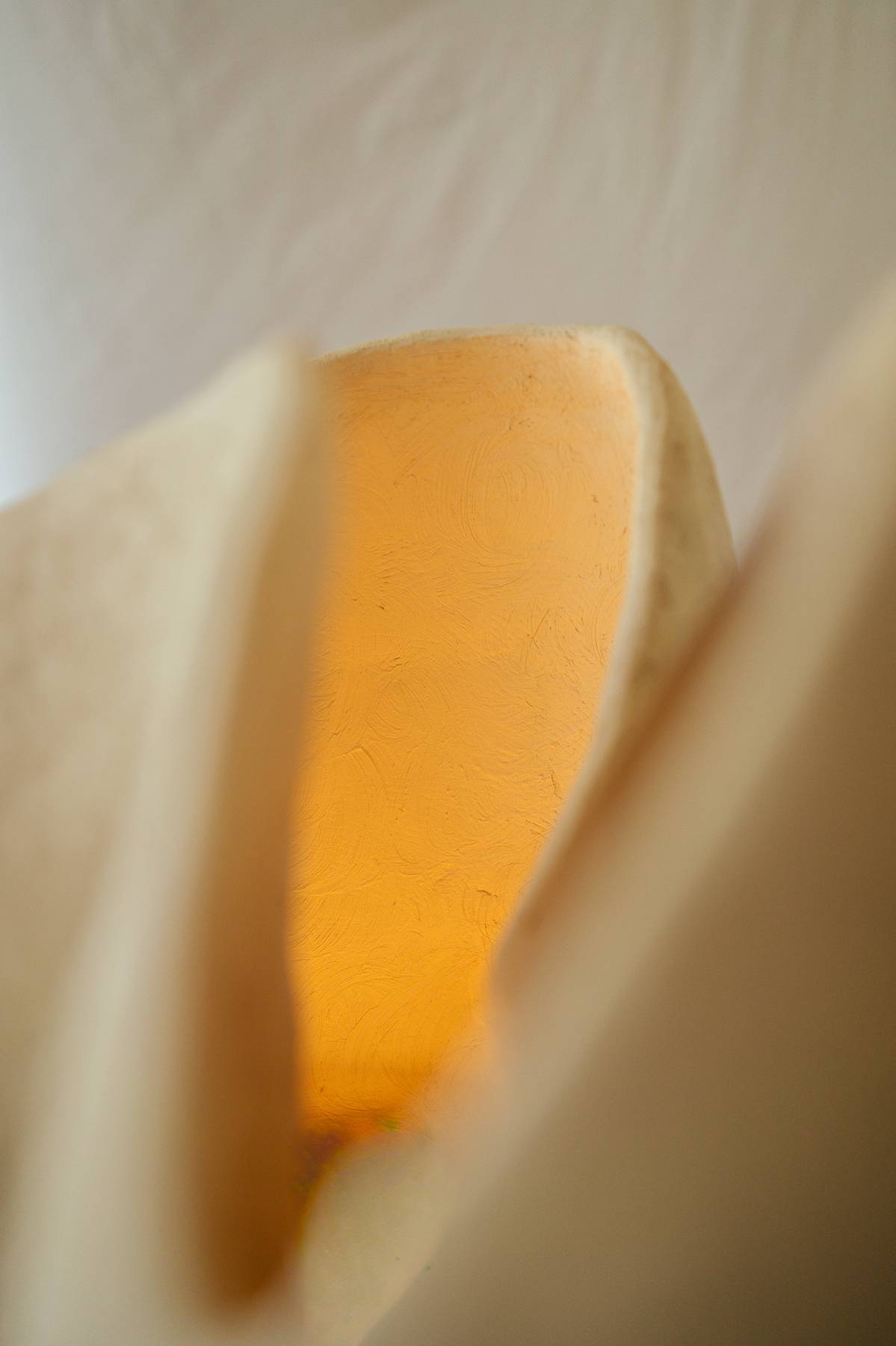 This stoneware light sculpture is defined by heightened form and expanded walls. Internal illumination traces the interior surface, drawing attention to the depth, rise, and flow of the shape while producing a warm, ambient glow.