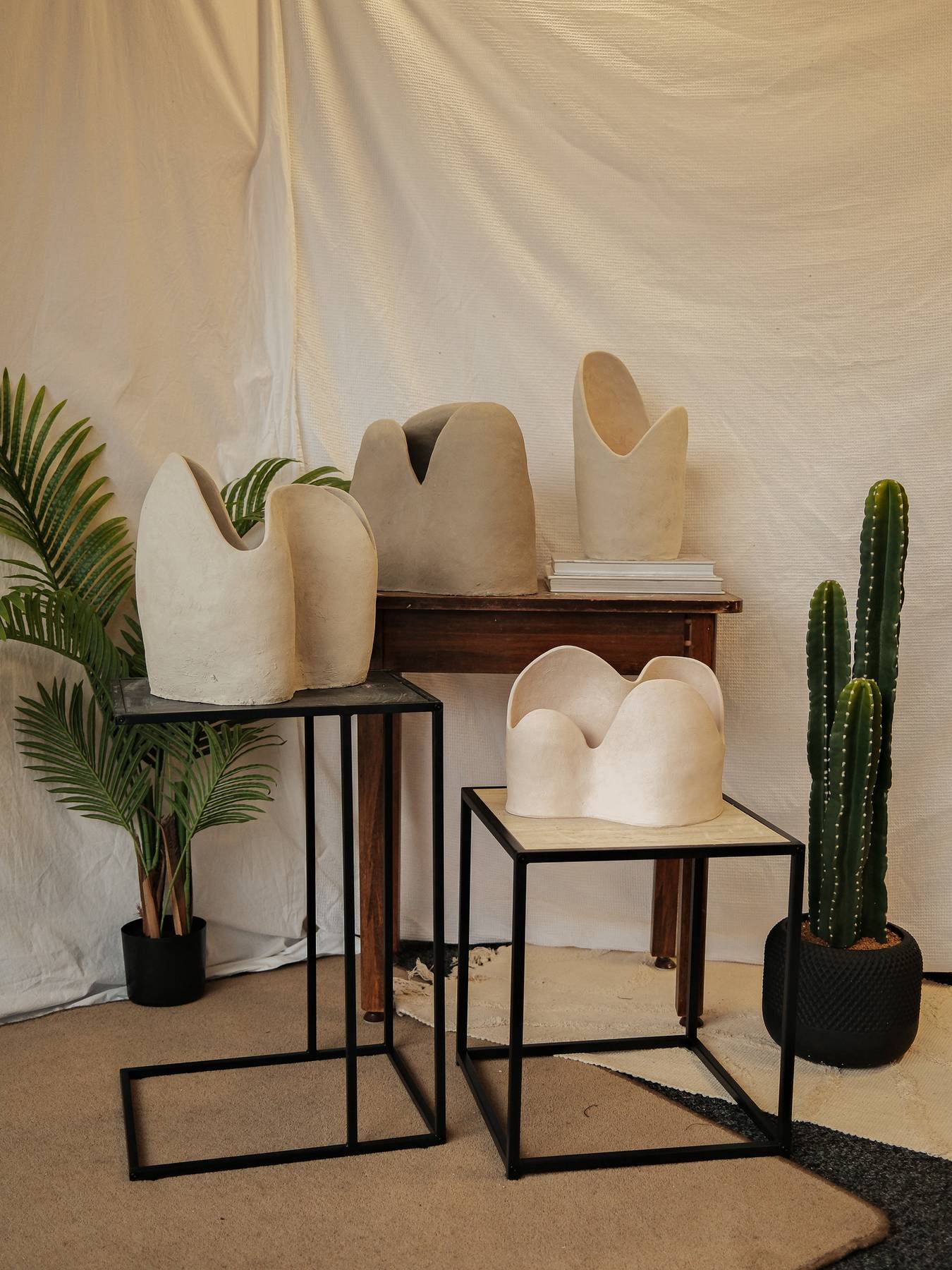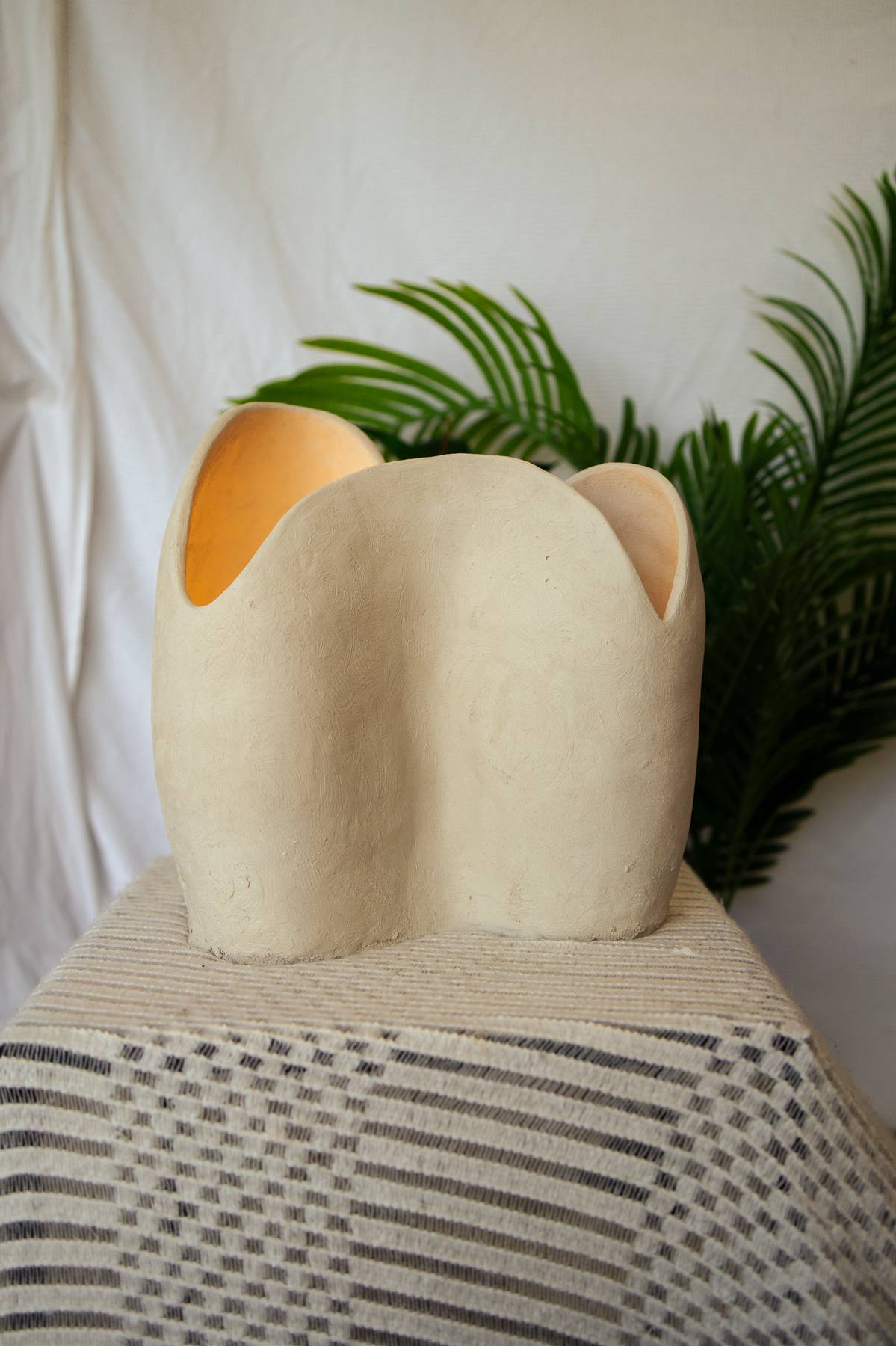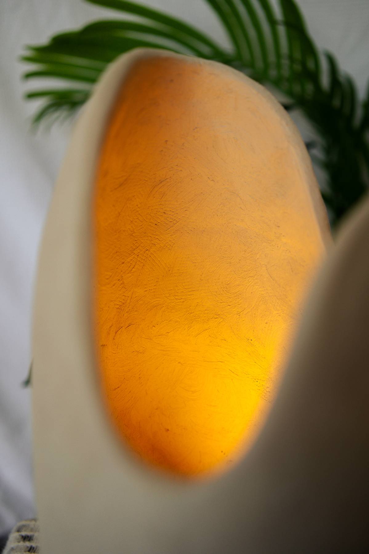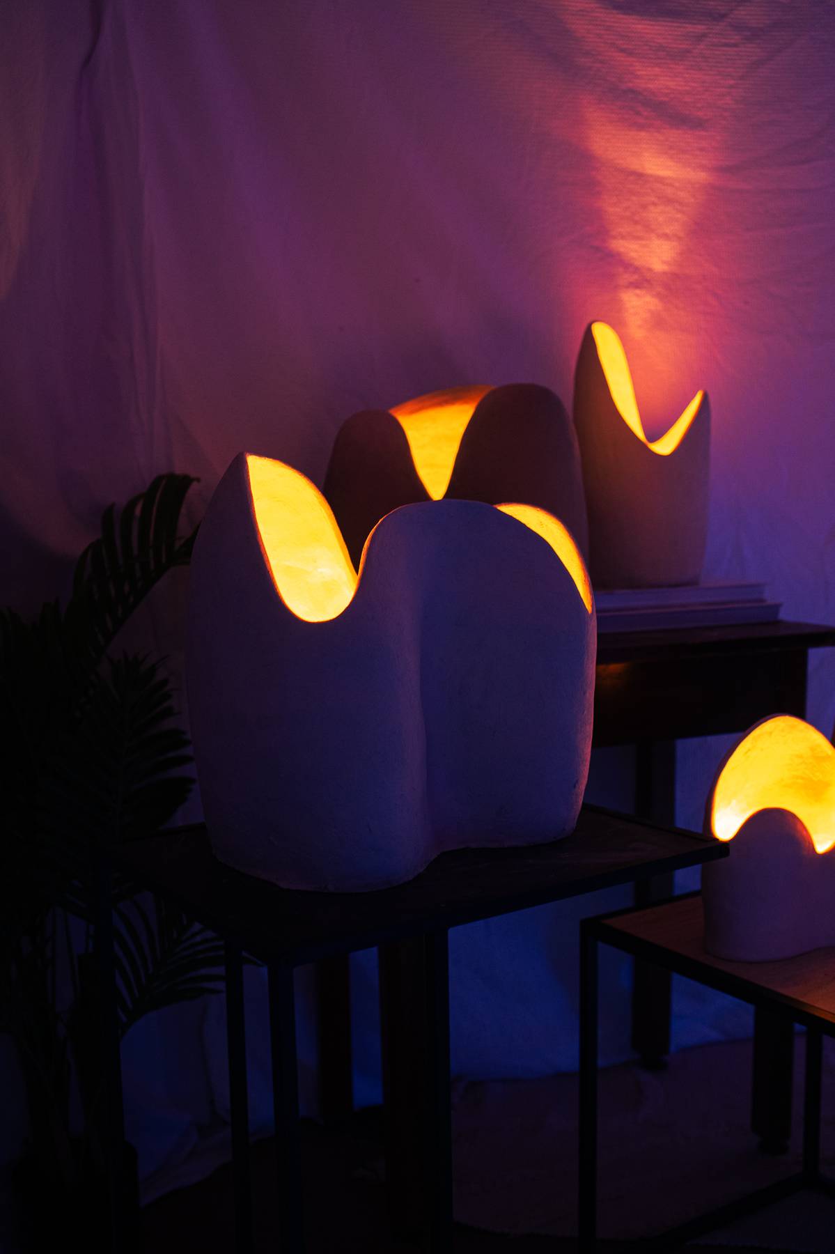 This stoneware light sculpture is defined by heightened form and expanded walls. Internal illumination traces the interior surface, drawing attention to the depth, rise, and flow of the shape while producing a warm, ambient glow.